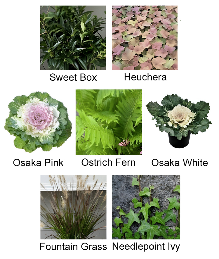 My go-to plants for Fall containers include assorted evergreens, ornamental grasses, cabbage, Heuchera, ferns, and cold-hardy vines. In this box makeover, I was able to fit a little bit of everything! Here are the plants I used: