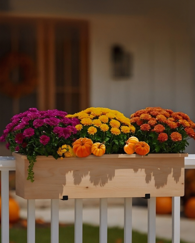 Railing planters offer clever placement and visual impact—just above eye level—making them perfect for fall decorating. They frame entryways, porches, and balconies with seasonal color, drawing attention to your home’s architecture while creating a warm and inviting welcome. By pairing deep autumnal tones like burgundy mums or rust-colored coleus with trailing ivy or ornamental kale, you can achieve layers of texture that capture the richness of the season. For a truly festive look, tuck in small decorative pumpkins or gourds among your plantings, or weave in dried corn husks and wheat stalks for a harvest-inspired touch.