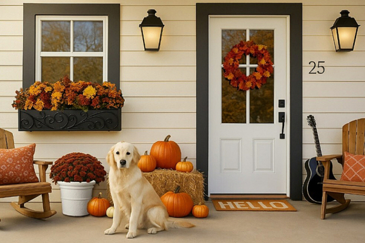 - Layer textures—window boxes with mums, dried wheat bundles and pumpkins—for that quintessential autumn charm.