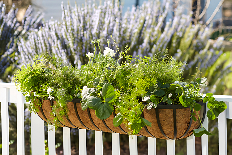 What about your railings? The English Hayrack Railing Planter mixes a sturdy yet decorative wrought iron frame with an all-natural, coconut coir planter liner. The simple bracket design means it installs in seconds, and the powder-coated steel frame is weather- and rust-resistant. Coconut coir liners come standard with it, and keep plants hydrated and soil aerated.